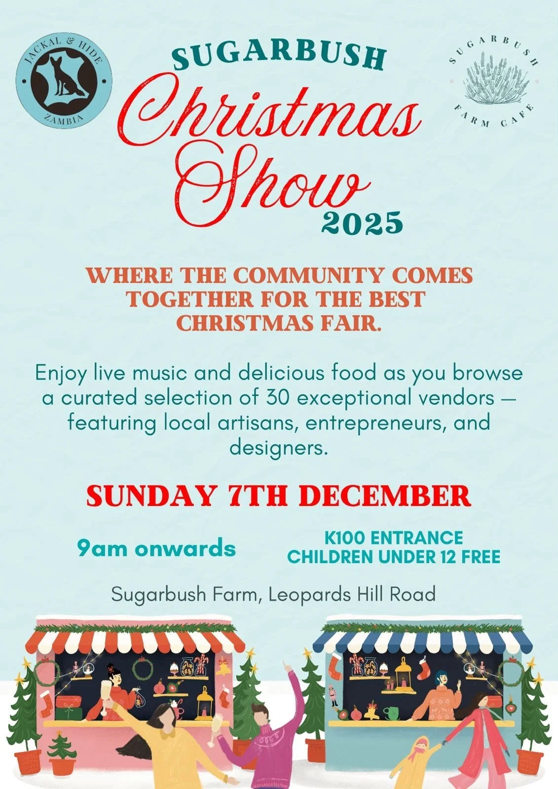 Get ready, Lusaka! The Sugarbush Christmas Show is back, bringing the city together for the most festive Christmas fair of the season. Experience a vibrant celebration of local talent with live music, delicious food, and a curated selection of 30 exceptional vendors featuring Zambia’s finest artisans, designers, and entrepreneurs.