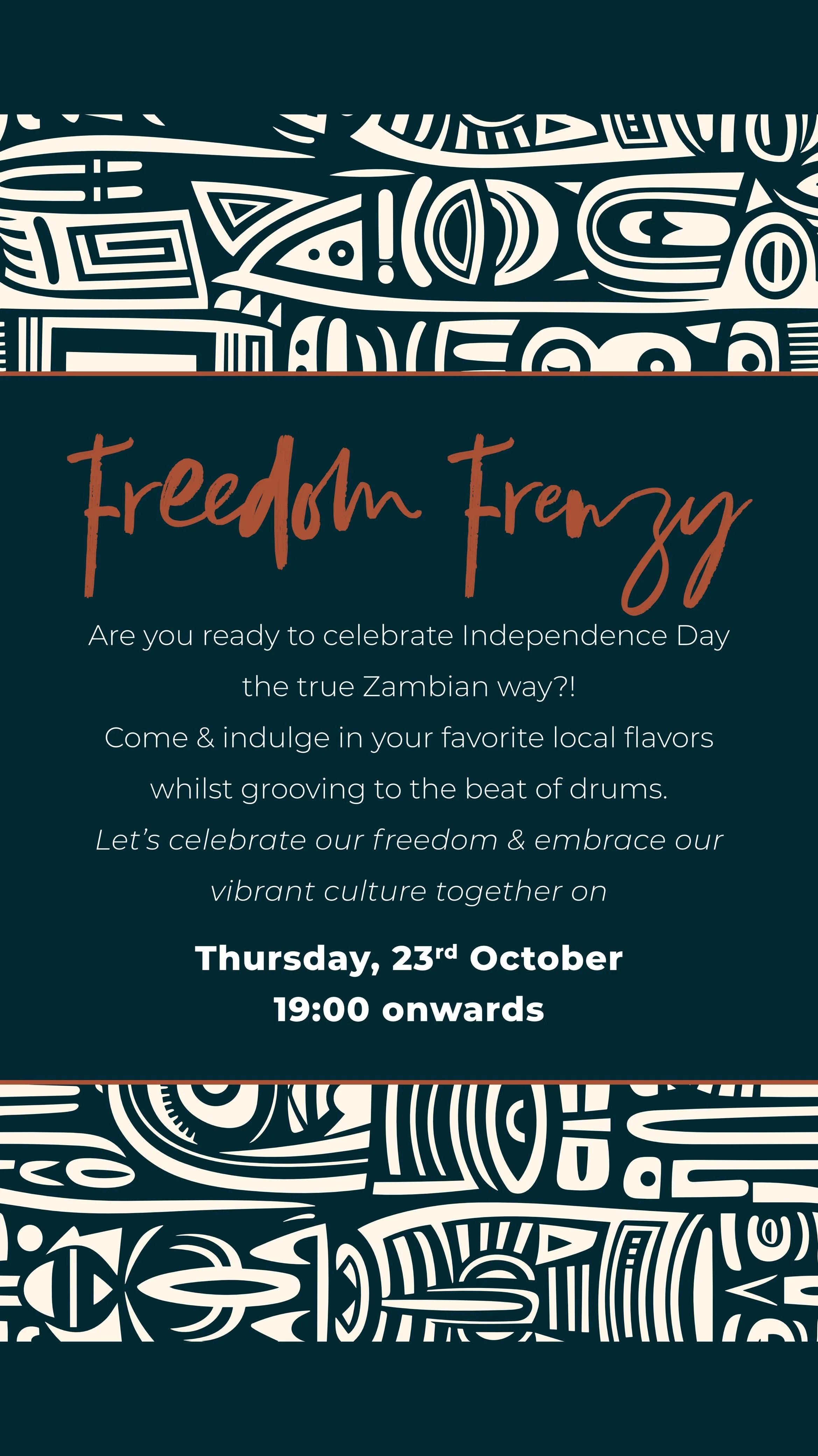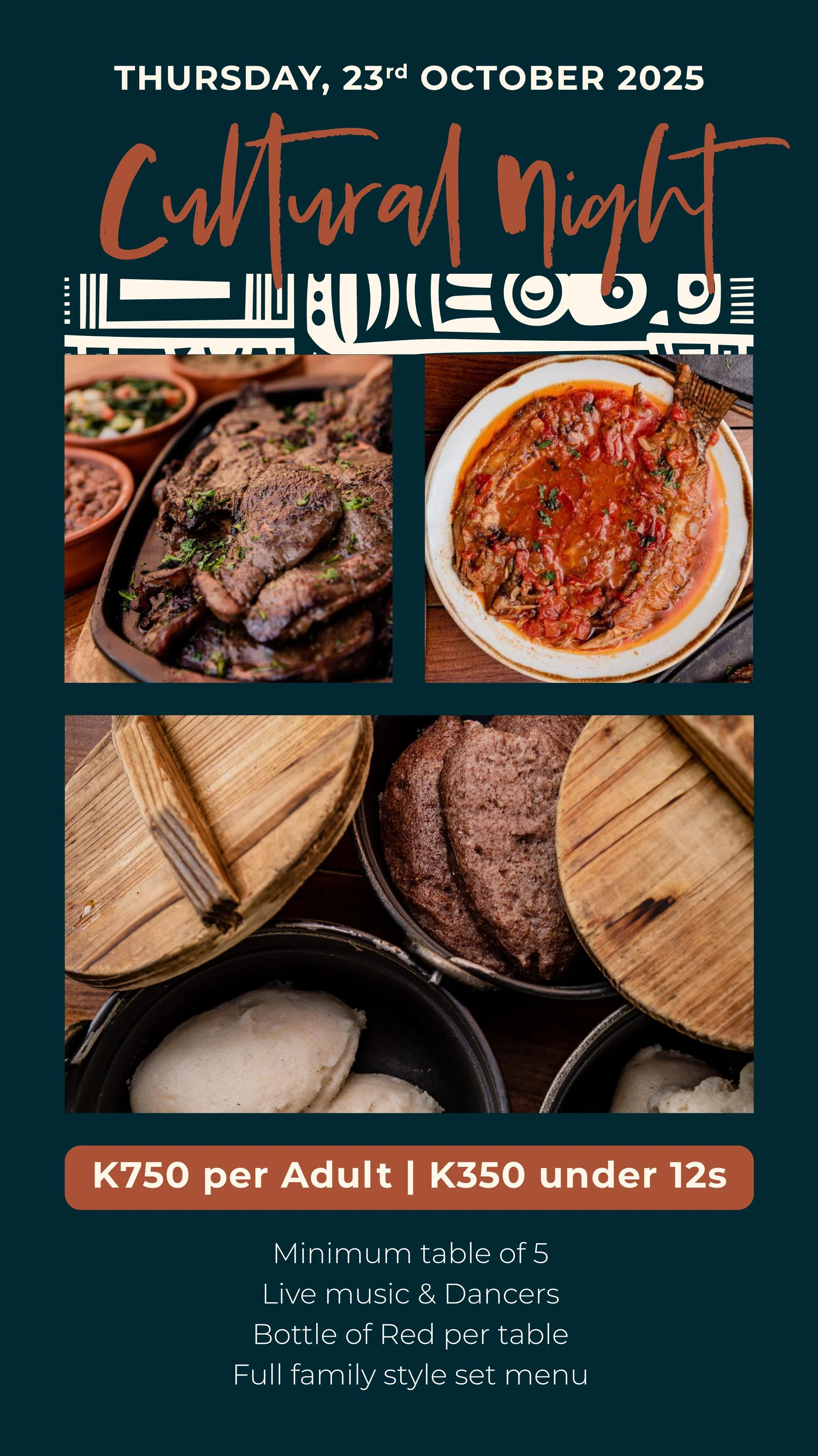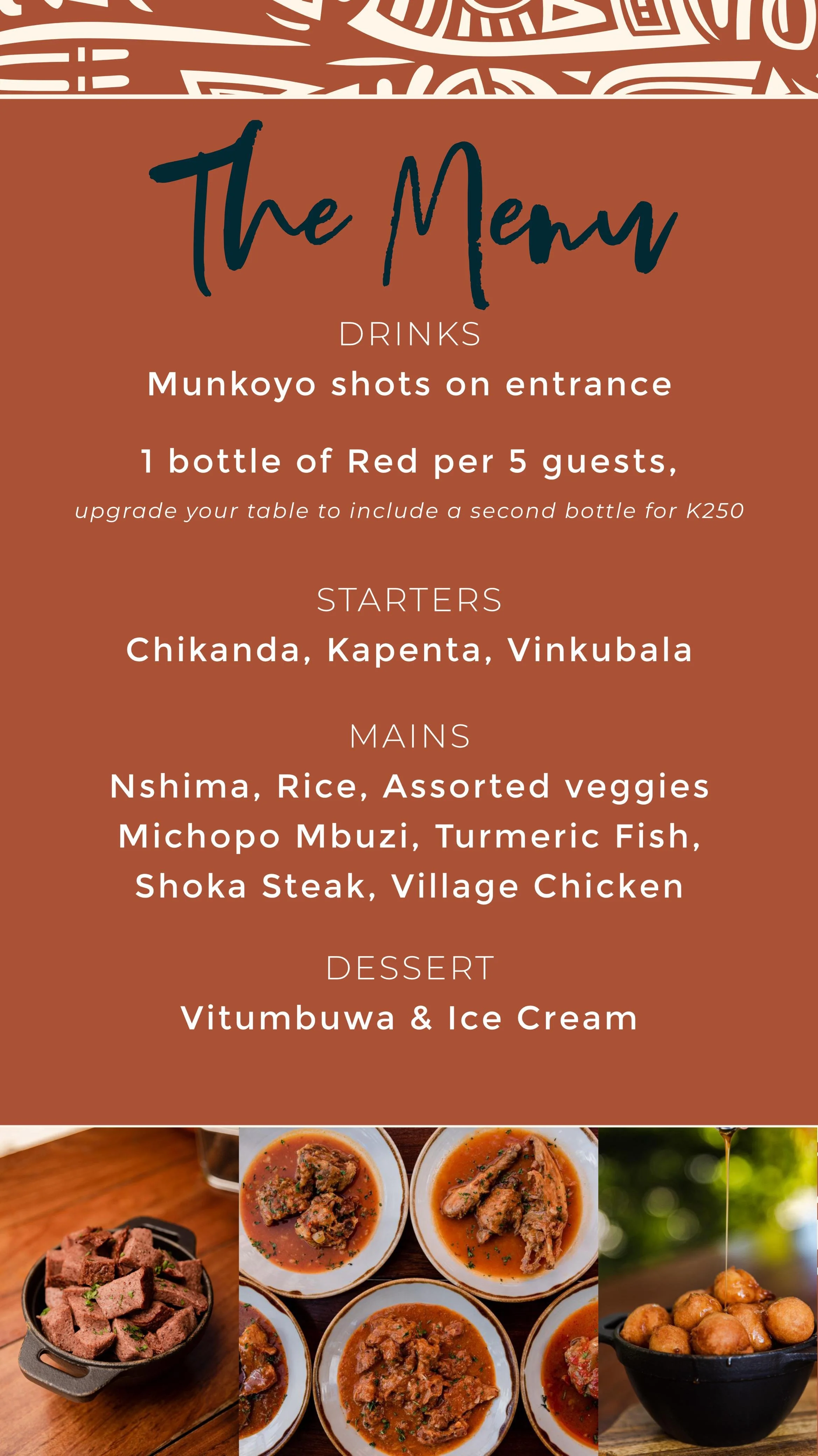 Enjoy a full family-style menu featuring beloved Zambian dishes, including Chikanda, Kapenta, and Vinkubala starters, followed by Nshima with assorted veggies, Michopo Mbuzi, Turmeric Fish, Shoka Steak, and Village Chicken. Finish with traditional Vitumbuwa and ice cream. Each table receives complimentary Munkoyo shots on arrival and a bottle of Red wine (second bottle available for K250).