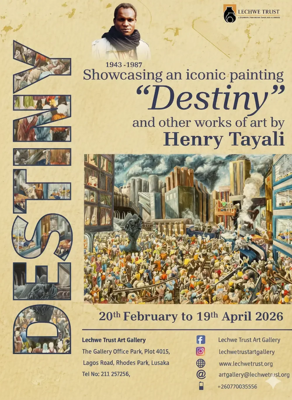 Lechwe Trust presents Destiny, a major Lusaka art exhibition by the late Henry Tayali, marking the first public showing in Lusaka of the painting Destiny in many years. Bringing together key works, the exhibition reflects Tayali’s enduring engagement with social life, labour, and the quiet tensions shaping everyday existence in Zambia. Shown in Lusaka today, Destiny offers both a rare encounter with one of the artist’s significant works and an entry point into the wider story of modern Zambian art. The exhibition is held in tribute to the late Mrs C.S. Zukas, whose lifelong commitment to preserving and supporting Zambian artists helped shape the country’s cultural landscape.
