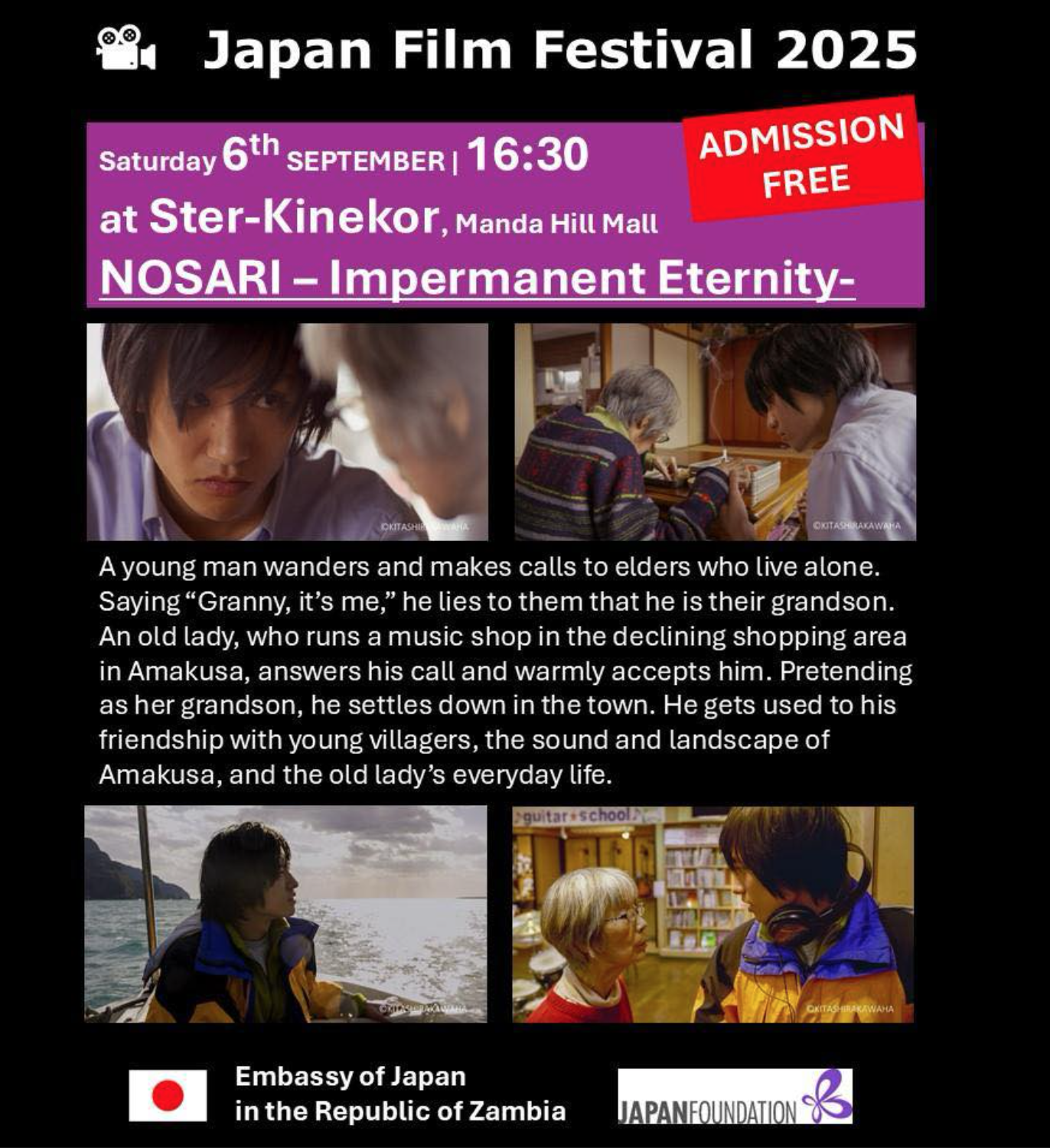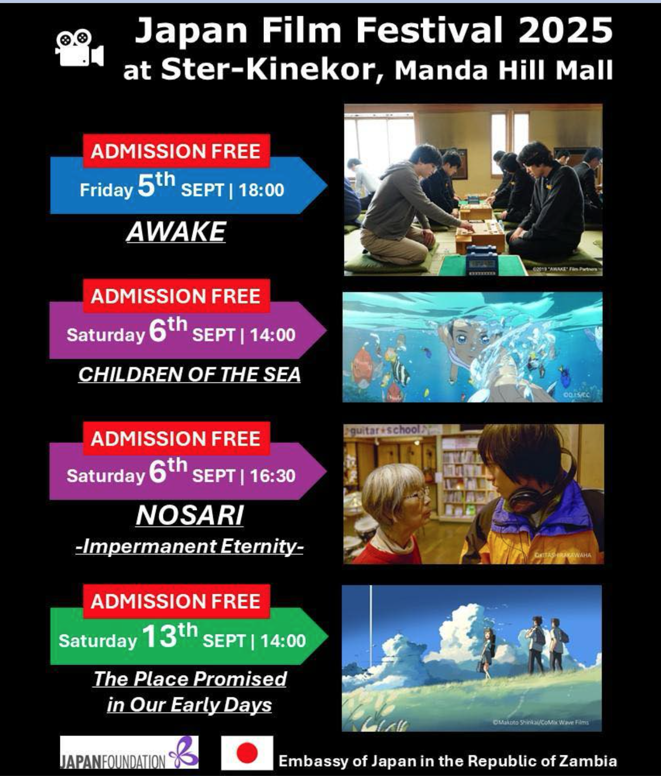 The Embassy of Japan in Zambia is bringing the Japan Film Festival 2025 to Lusaka, offering a unique cultural experience for film lovers and anyone looking for exciting things to do in the city. This free festival will take place at Ster-Kinekor, Manda Hill Mall, and showcases a selection of remarkable Japanese films, highlighting the rich culture, storytelling, and cinematic artistry of Japan.