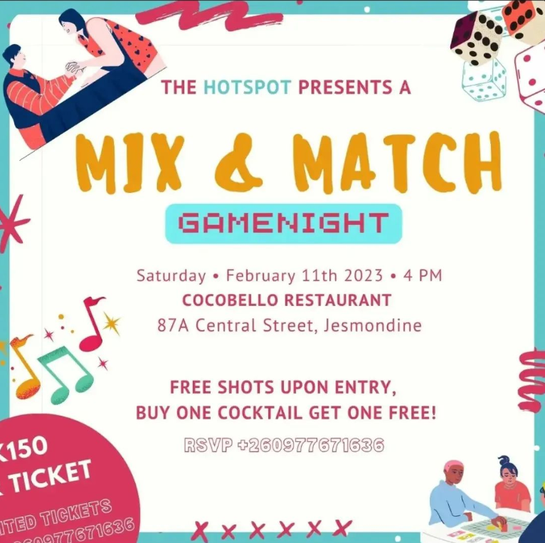 Mix & Match GameNight @ Cocobello Saturday, February 11, 2023 4:00 PM 9:00 PM Cocobello Lusaka, Lusaka Province Zambia (map) Google Calendar ICS
