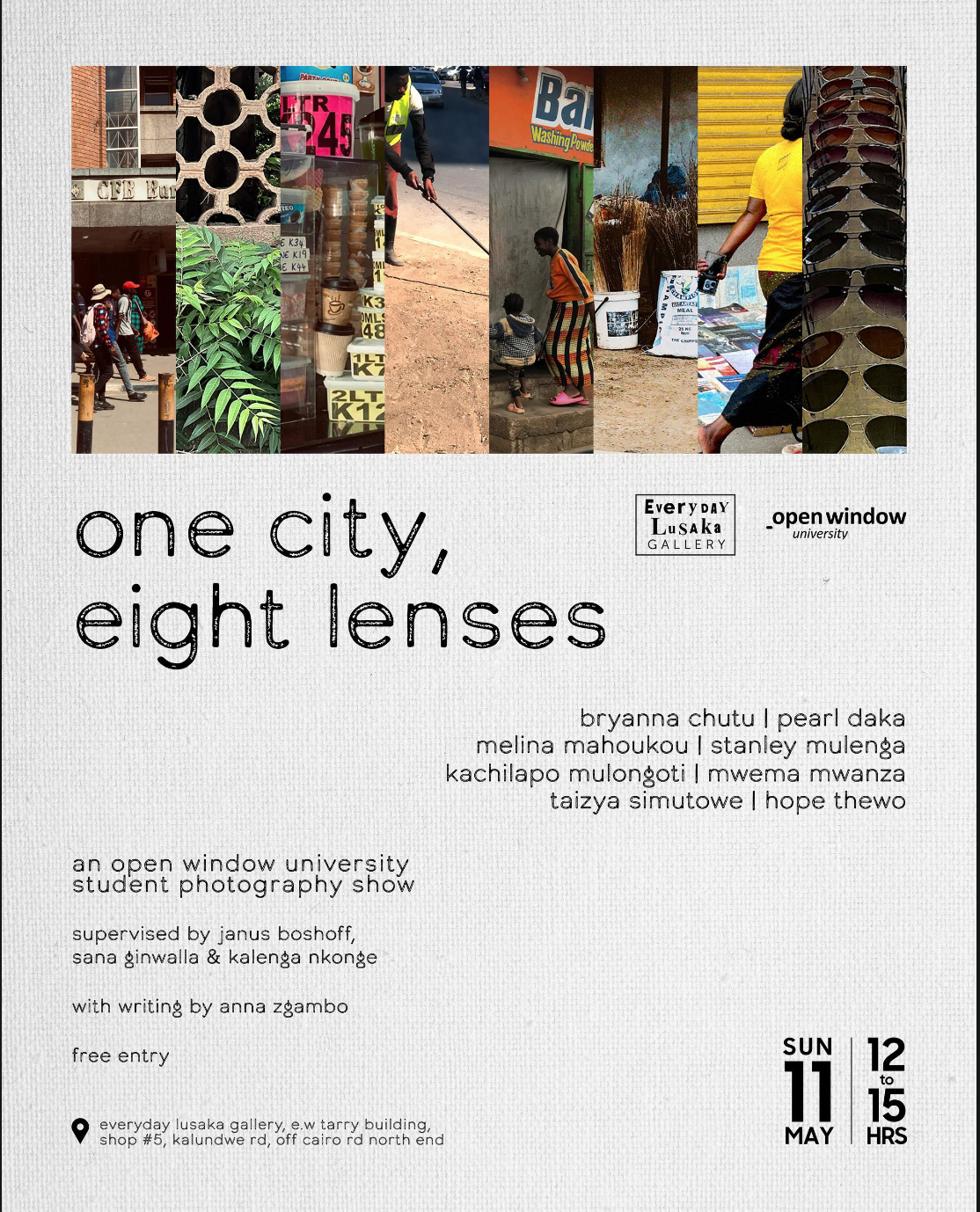 The show is supervised by seasoned photographers and lecturers Janus Boshoff, Kalenga Nkonge, and Everyday Lusaka founder Sana Ginwalla. Adding an extra layer of depth, the exhibition text is written by Anna Zgambo, a recent Open Window University graduate in Creative Writing, bringing Lusaka's visual culture to life with her words.