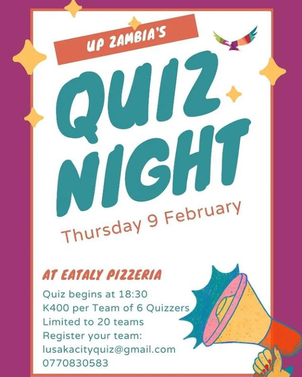 UP Zambia on Thursday 9th February, 2023 will be having a Quiz Night at Eataly Pizzeria at 18:30 hours. This is a fundraiser to raise money to UP Zambia services for children in the criminal justice system.